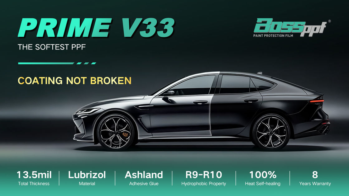 Prime V33 13,5mil TPU Autolak Beschermfolie biedt superieure hoogglans, krasbestendige bescherming met langdurige duurzaamheid, ondersteund door een beperkte garantie van 8 jaar.